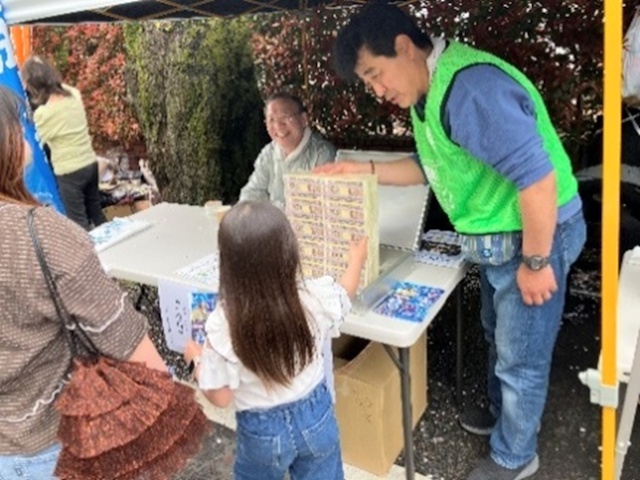 また第9地区副地区長の佐久間さんは、自ら当会事務局へイータ君、のぼり、租税教育冊子等の受け取りに行っていただいた事に加え、親子で当会ブース用テントの設営・撤収作業も引き受けていただき、さらに息子さんご夫婦にはイータ君に入ってもらい大感謝いたします。